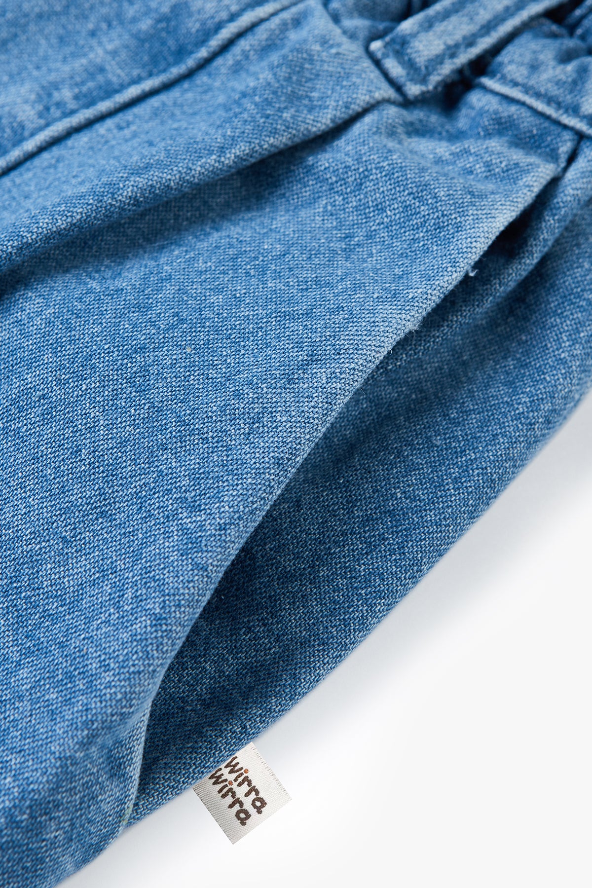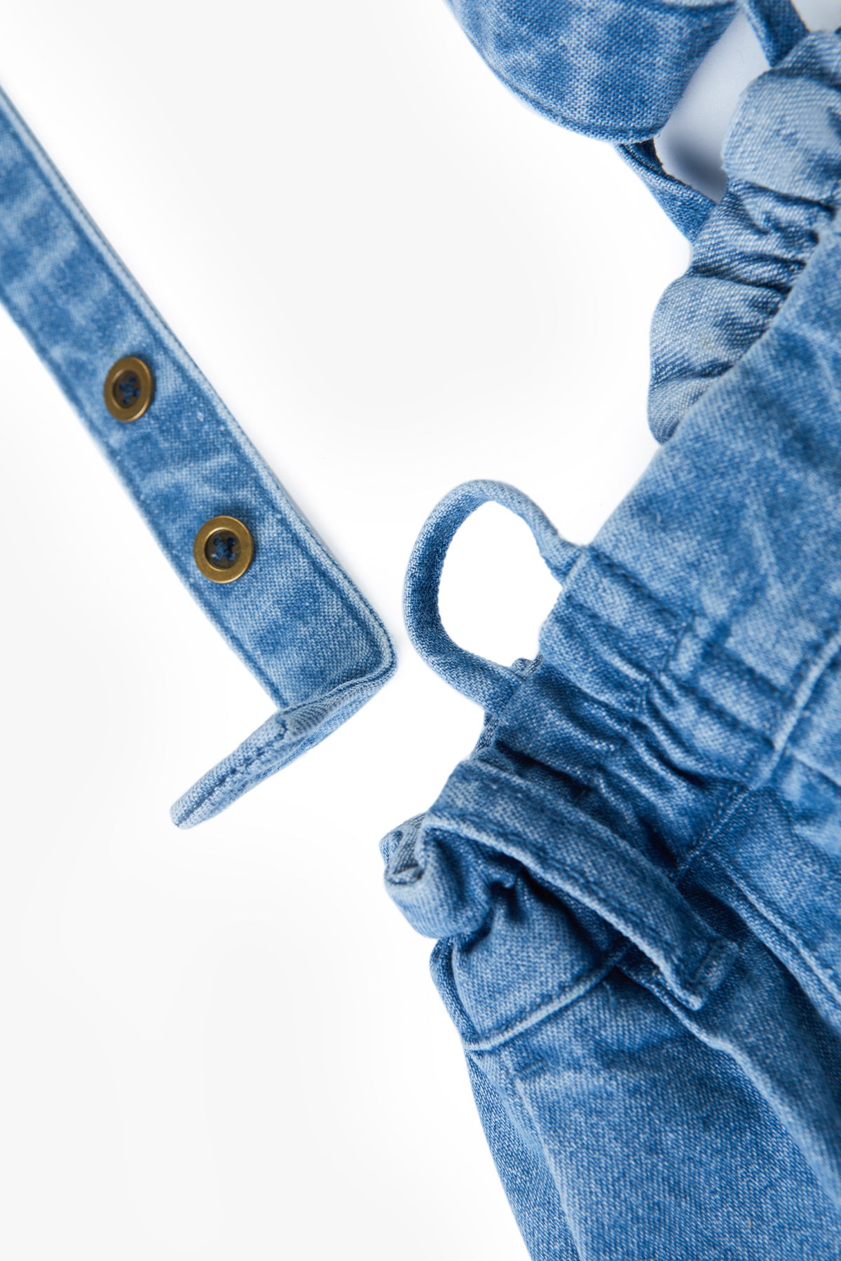 Introducing the Blue Vintage Denim Suspender Pants, a durable and stylish choice for your little one. These pants feature plant-based fibers for eco-friendly wear, a loose fit with a carrot-shaped design, detachable suspenders, and elastic waist for comfort. In TEX-certified denim blue, these pants offer a blend of comfort and vintage charm. Made from 65.6% cotton, 18% regenerated cellulose fibers, and 16.4% polyester, they provide a soft, skin-friendly, and durable option for your child.